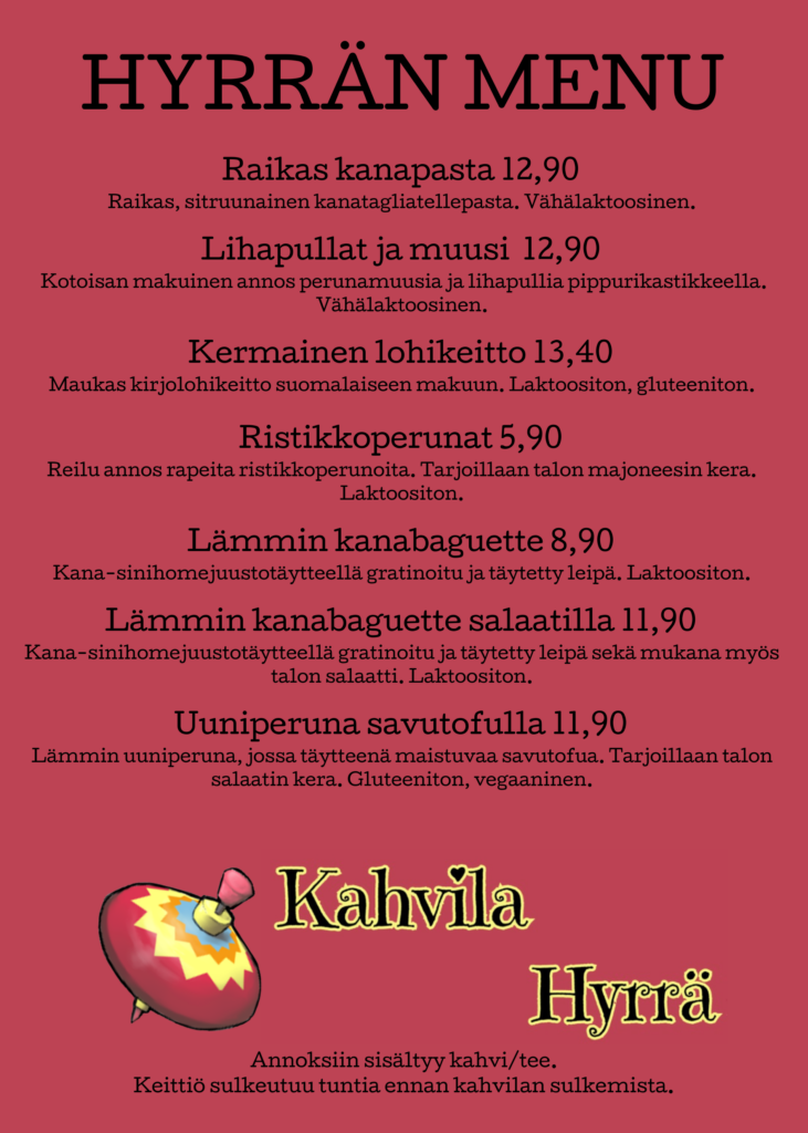 Lounas Lounas Hyrrässä maistuvaa lounasta! Lounasta voi tilata tuntia ennen sulkemista asti ja se sisältää kahvin tai teen. Meille käy ePassi ja Edenred. Lounaan saa vain paikan päällä nautittavaksi. Lohikeiton kanssa tarjoillaan ruisleipää.